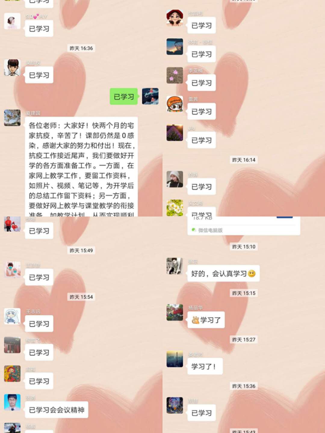 会议结束后,公共课部、思政课部立即就会议内容进行了归纳整理,并及时响应学校安排,组织课部全体教职工学习会议精神及文件内容,传达并贯彻落实省委教育工委、省教育厅有关工作要求。同时夏建国主任对课部全体教职工,在疫情延期开学期间的倾心付出和努力表示肯定和感谢,也就准备开学阶段的工作做了详细的安排部署。一方面,居家线上教学工作,要留有工作资料,为开学后的总结工作留有参考;另一方面,要做好网上教学与课堂教学的衔接准备,例如教学计划等,从而实现顺利衔接、顺利过渡。