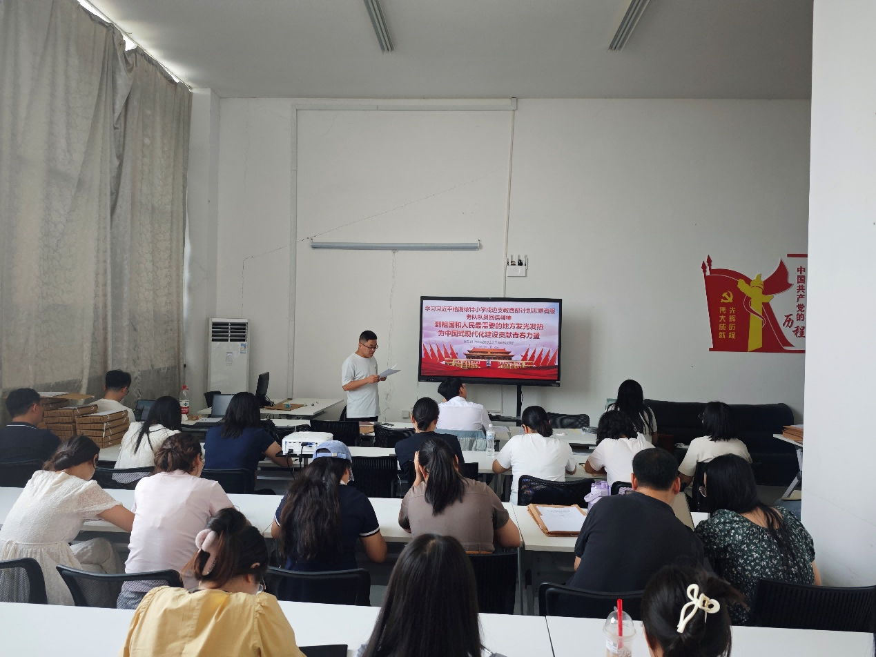活动伊始,何文成同志首先带领全体党员深入学习了习近平总书记的回信内容。回信中,习近平总书记对谢依特小学戍边支教西部计划志愿者服务队全体队员给予了高度评价,赞扬他们“到祖国和人民最需要的地方去”的崇高精神,并鼓励广大青年为中国式现代化建设贡献青春力量。何文成同志强调,这封回信不仅是对青年志愿者的肯定,更是对全体思政课教师的殷切期望。他指出,作为马克思主义学院的教师,要深刻领会回信精神的丰富内涵,将习近平总书记的嘱托转化为教书育人的实际行动。